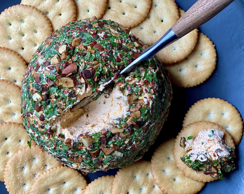 - Combine the cooled nuts with the ground pink pepper and parsley in a small bowl, then spread onto a dinner plate. Remove the cheeseball from the fridge and discard the plastic wrap. Gently roll the ball in the nut mixture to coat.