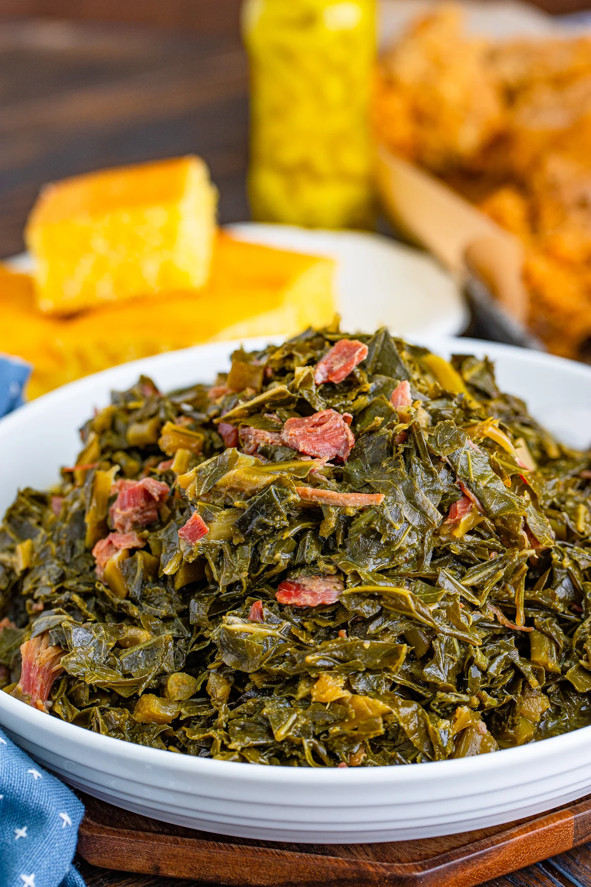 • 6 pounds greens, such as mustard greens, collard greens, turnip greens, kale, or spinach, rinsed well, picked over, and stemmed
